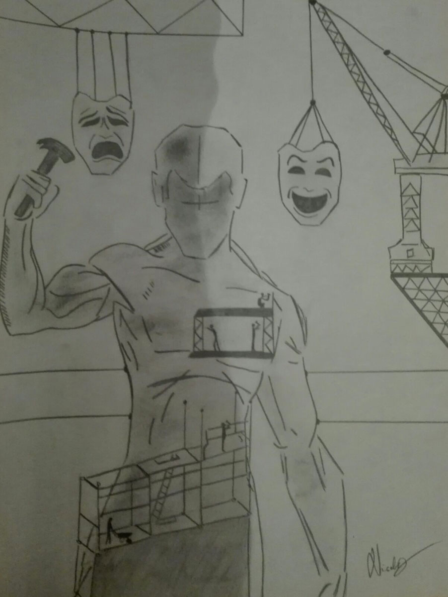“Il lavoro su se stessi è il lavoro più difficile ma ci dà la possibilità di intraprendere un meraviglioso viaggio nella propria interiorità. Nel disegno in alto viene tolta la maschera della tristezza che viene sostituita da quella della gioia. Gli omini stanno lavorando sul corpo, specialmente sul cuore, organo associato al dolore. Infine il personaggio che impugna il martello indica la forte volontà di cambiare e lottare contro le proprie paure”